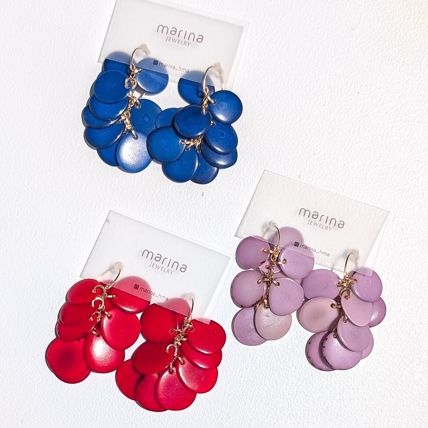 ヤシの種のスライスを何層にも重ねた、動きのあるピアスです。