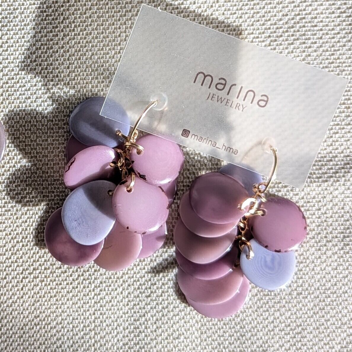 ヤシの種のスライスを何層にも重ねた、動きのあるピアスです。