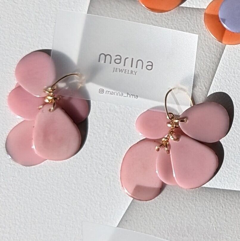ヤシの種のスライスを何層にも重ねた、動きのあるピアスです。